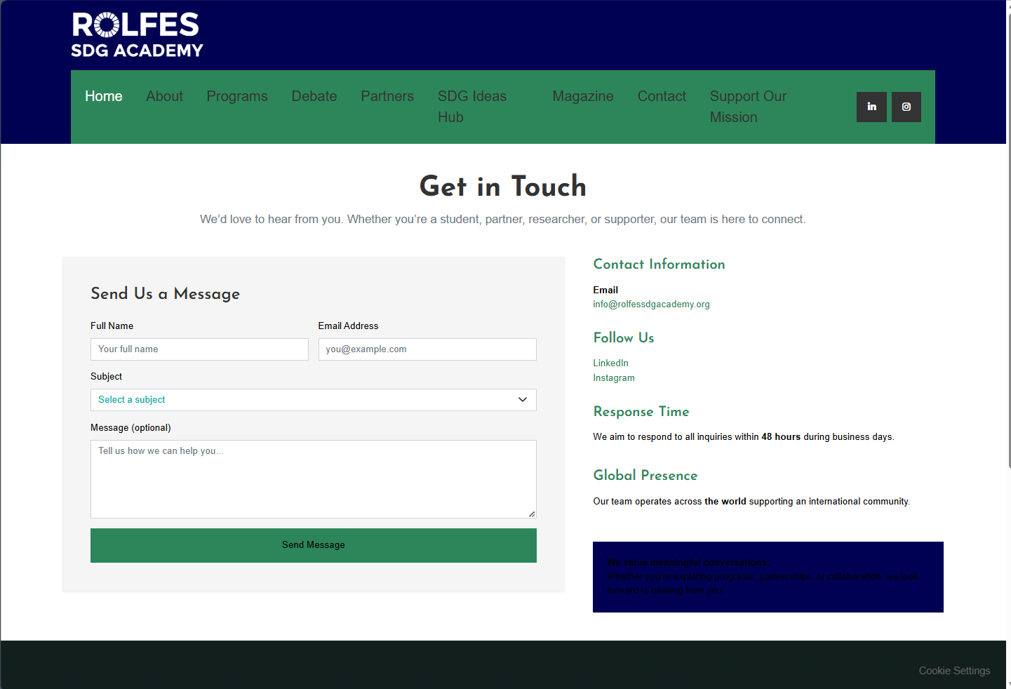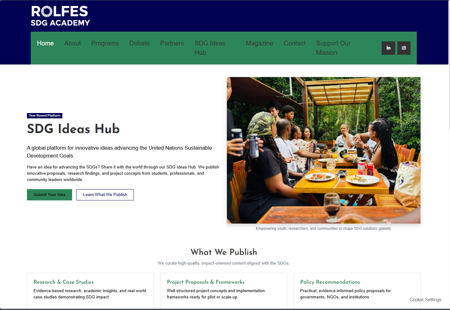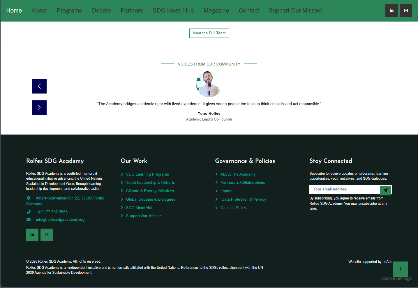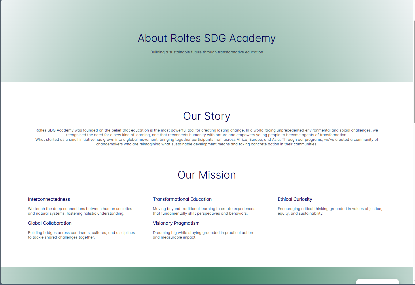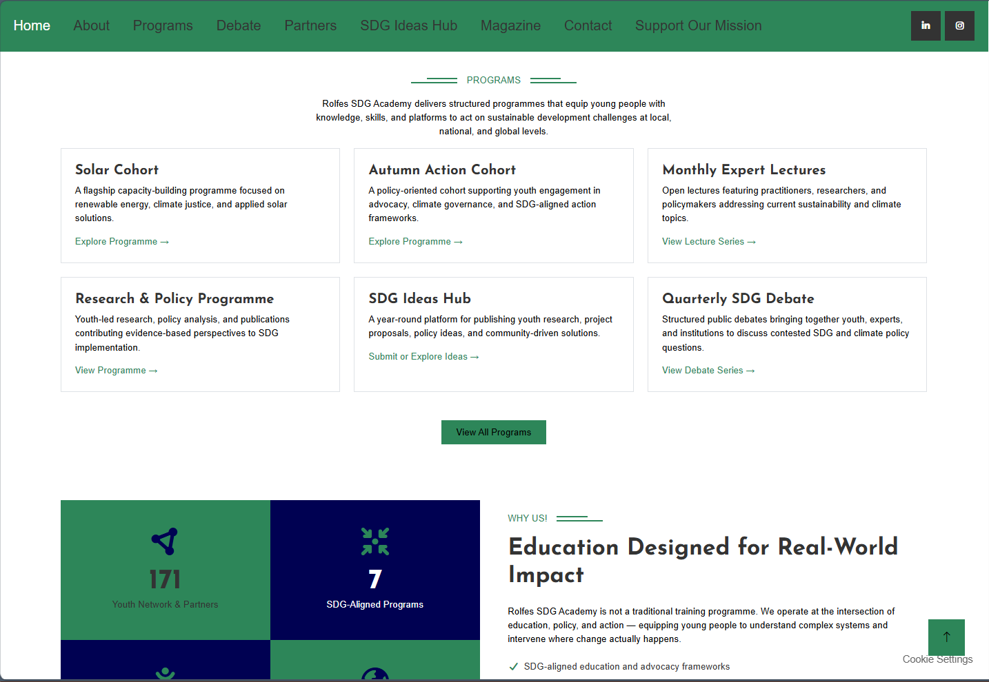 Rolfes SDG Academy needed a complete website refresh to improve visual hierarchy, clarify the main navigation, and present programs, partnerships, and impact in a more accessible way. This redesign aligned the interface with the Academy's mission while making key pages easier to scan and act on.