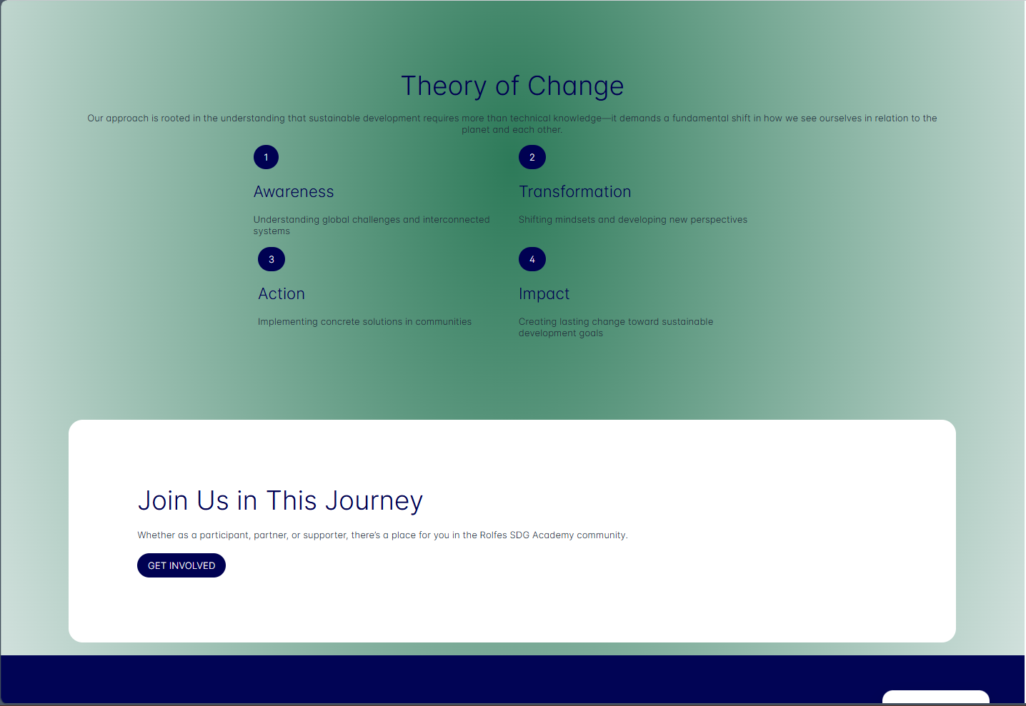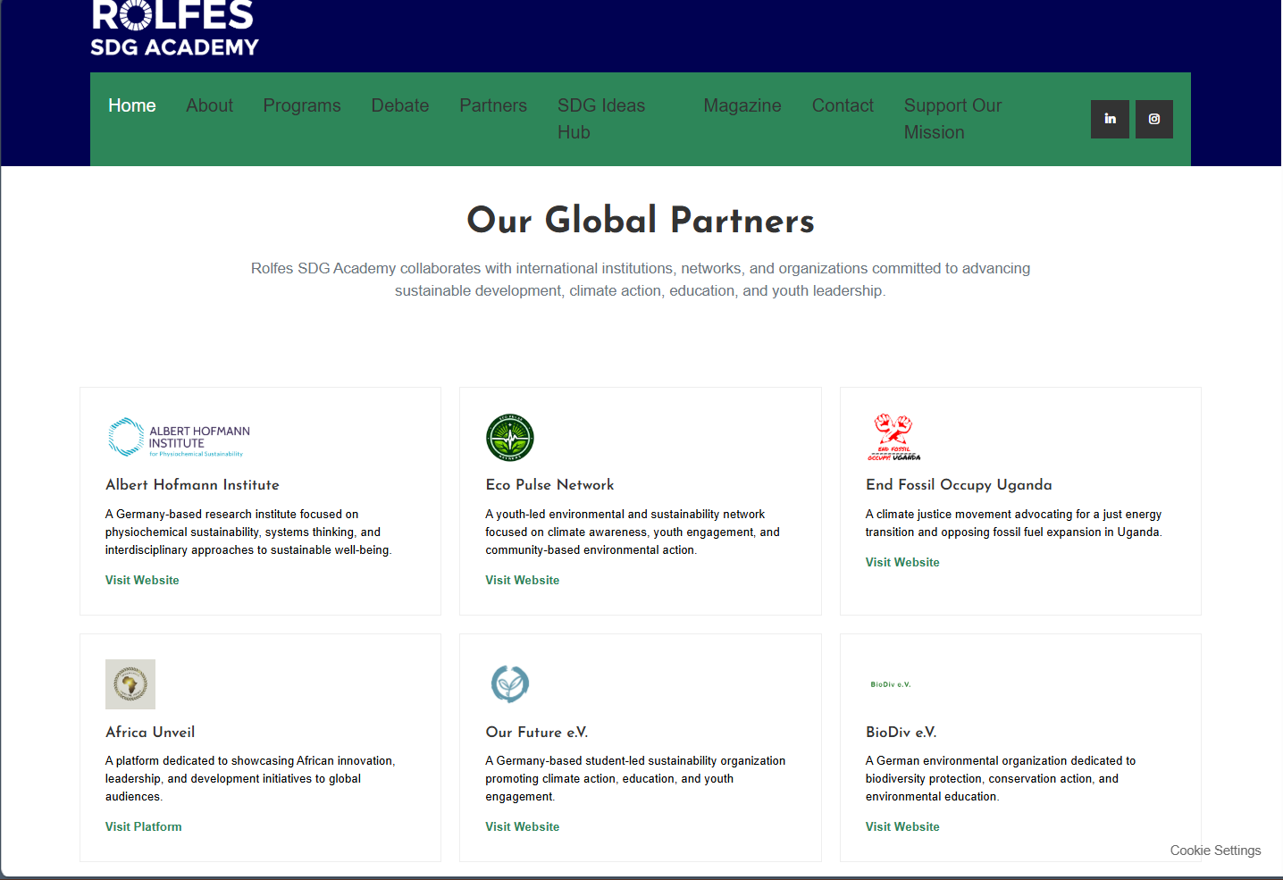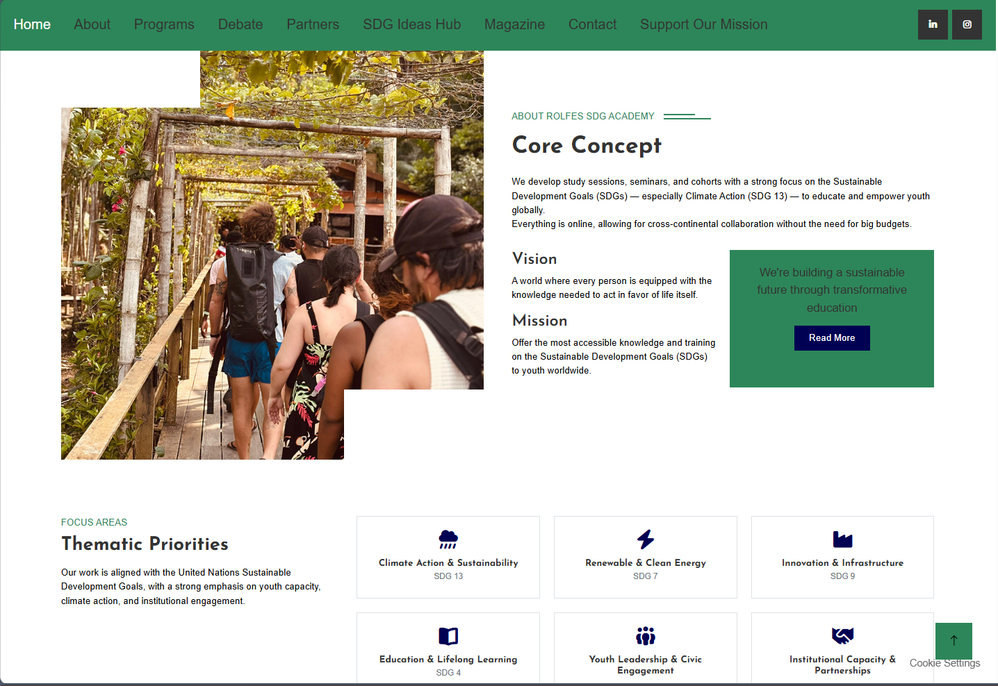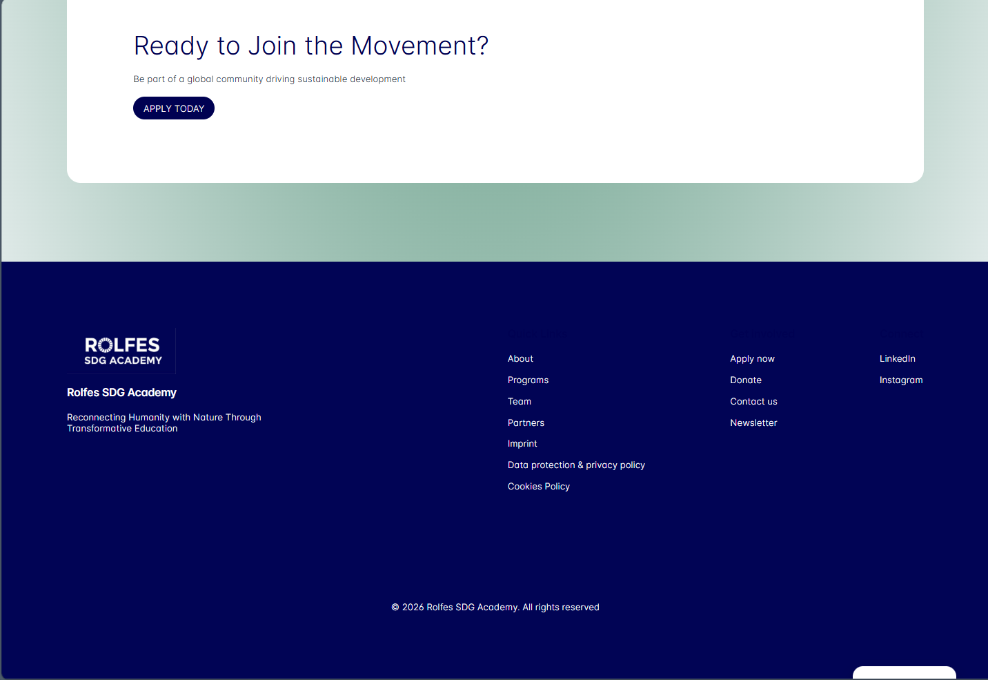Rolfes SDG Academy needed a complete website refresh to improve visual hierarchy, clarify the main navigation, and present programs, partnerships, and impact in a more accessible way. This redesign aligned the interface with the Academy's mission while making key pages easier to scan and act on.