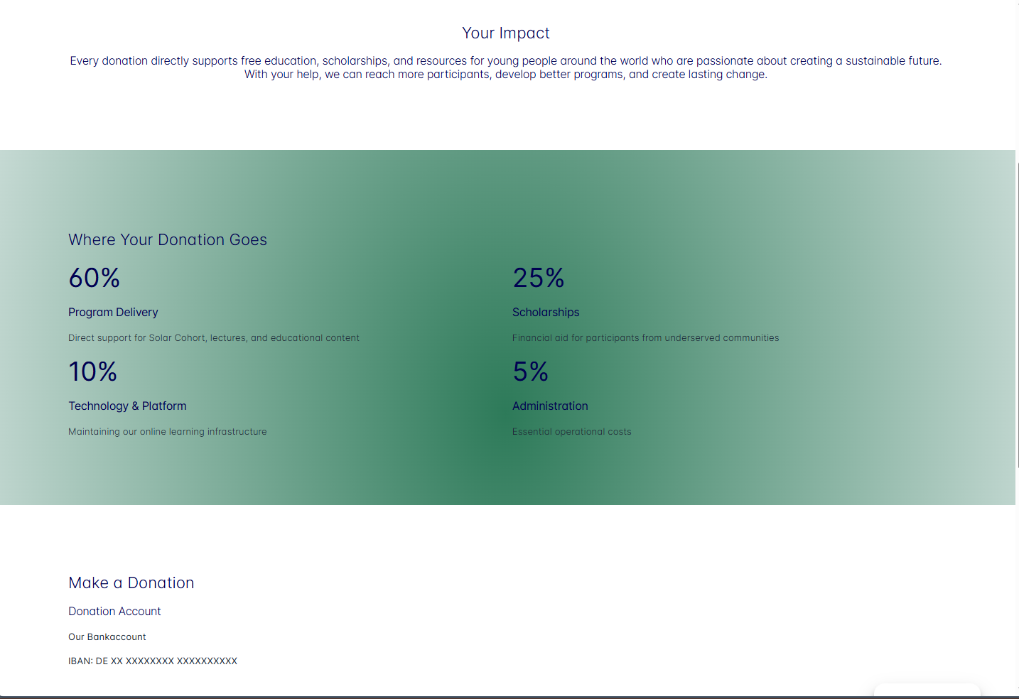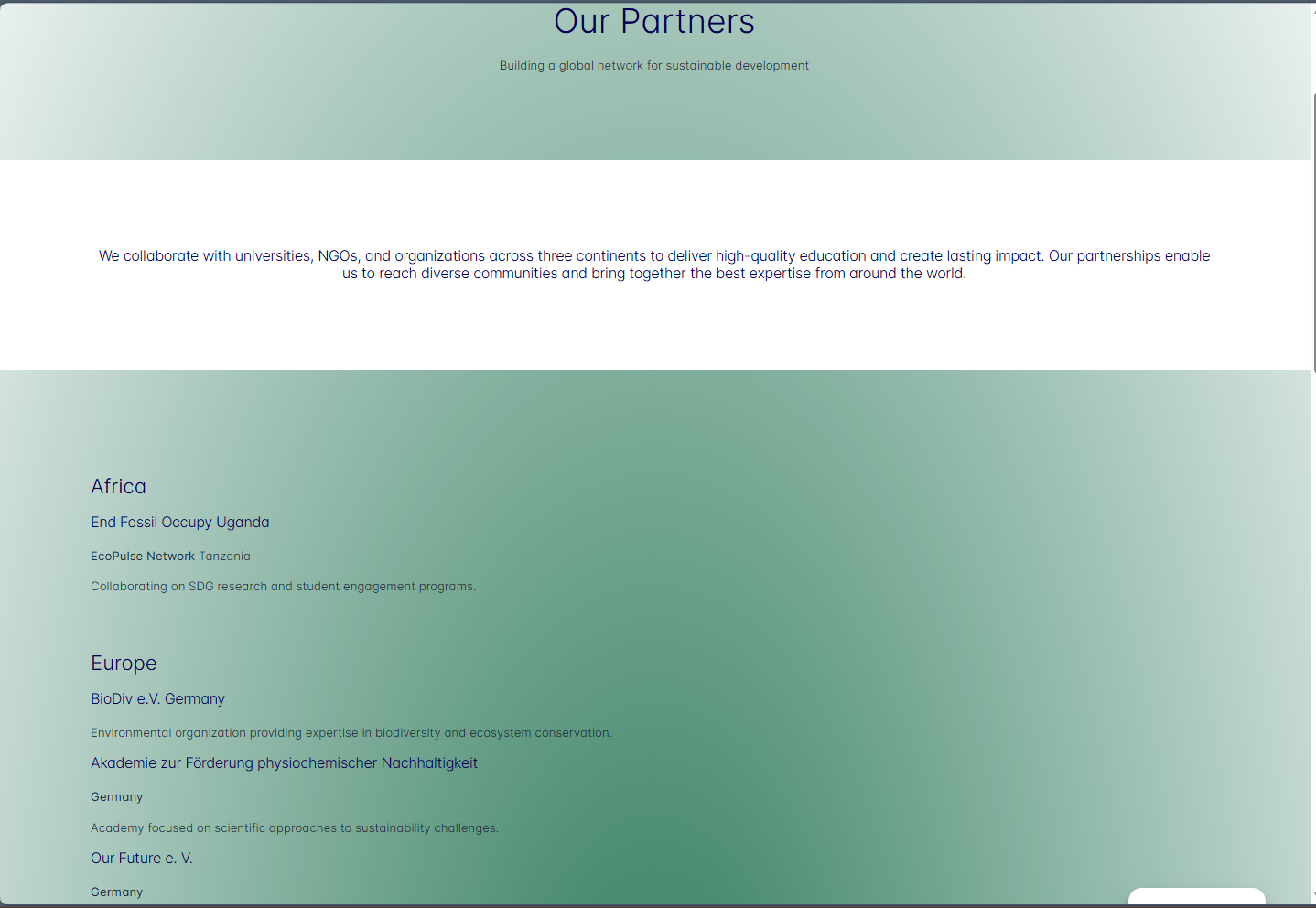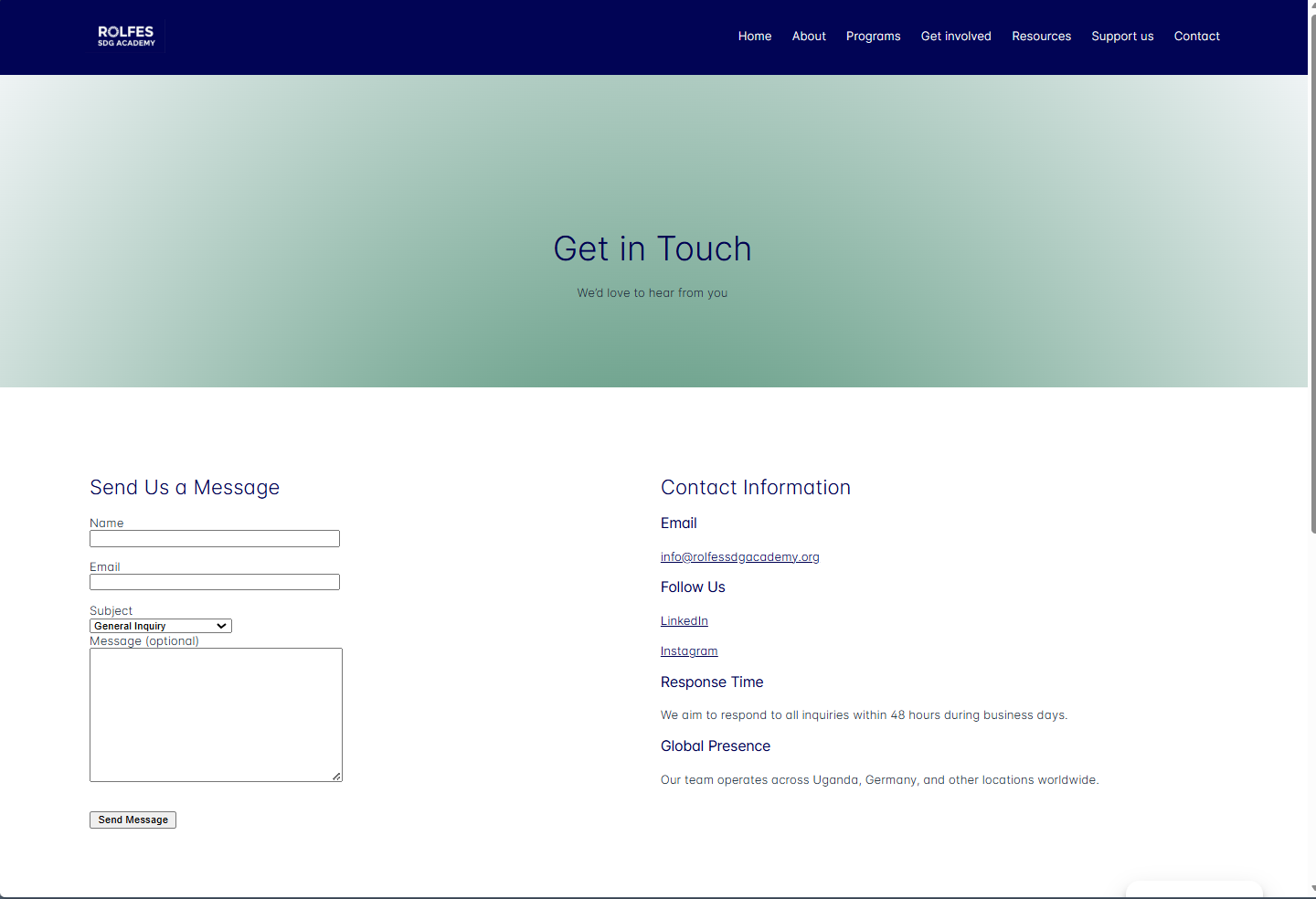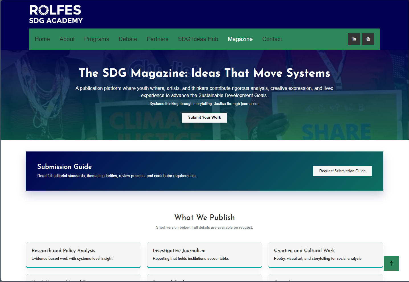 Rolfes SDG Academy needed a complete website refresh to improve visual hierarchy, clarify the main navigation, and present programs, partnerships, and impact in a more accessible way. This redesign aligned the interface with the Academy's mission while making key pages easier to scan and act on.